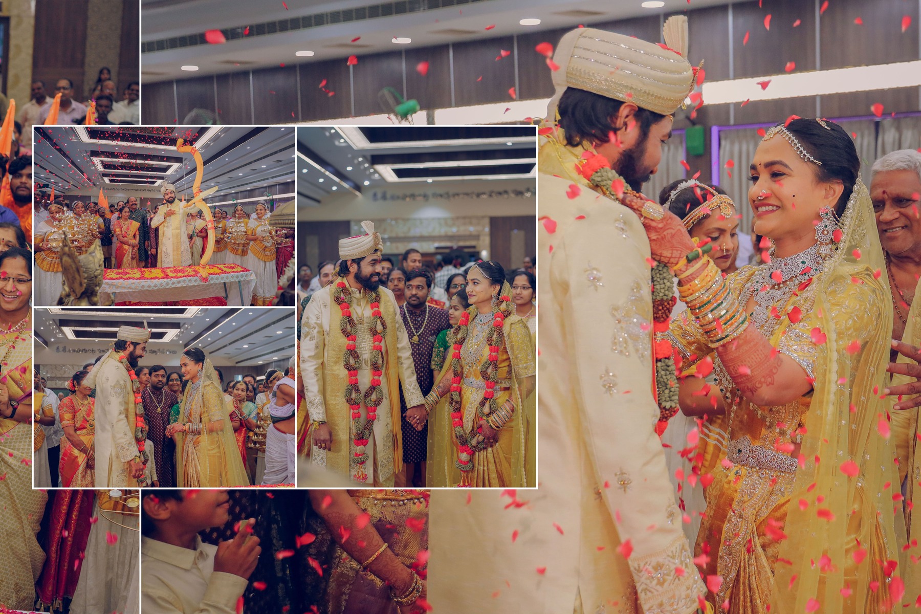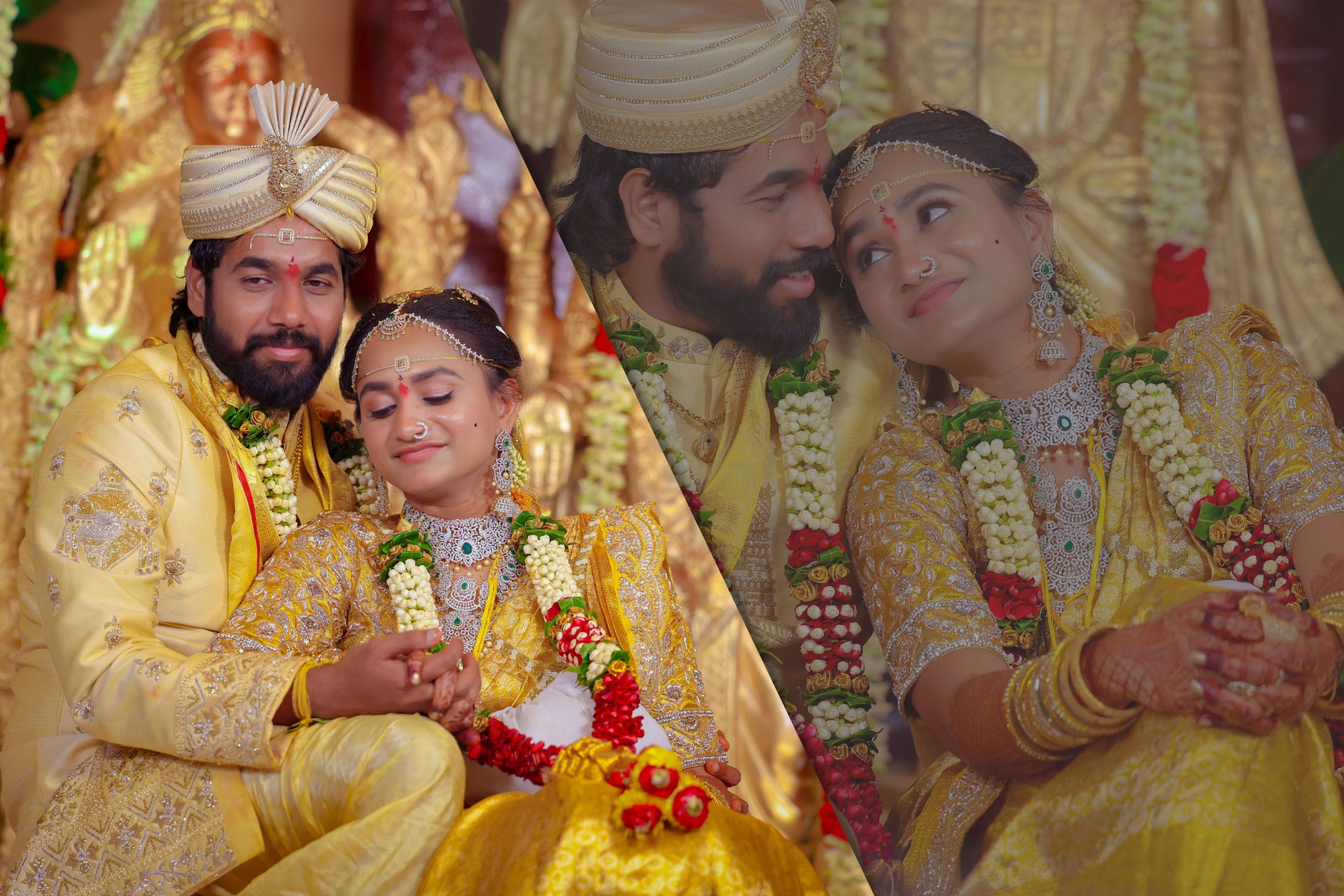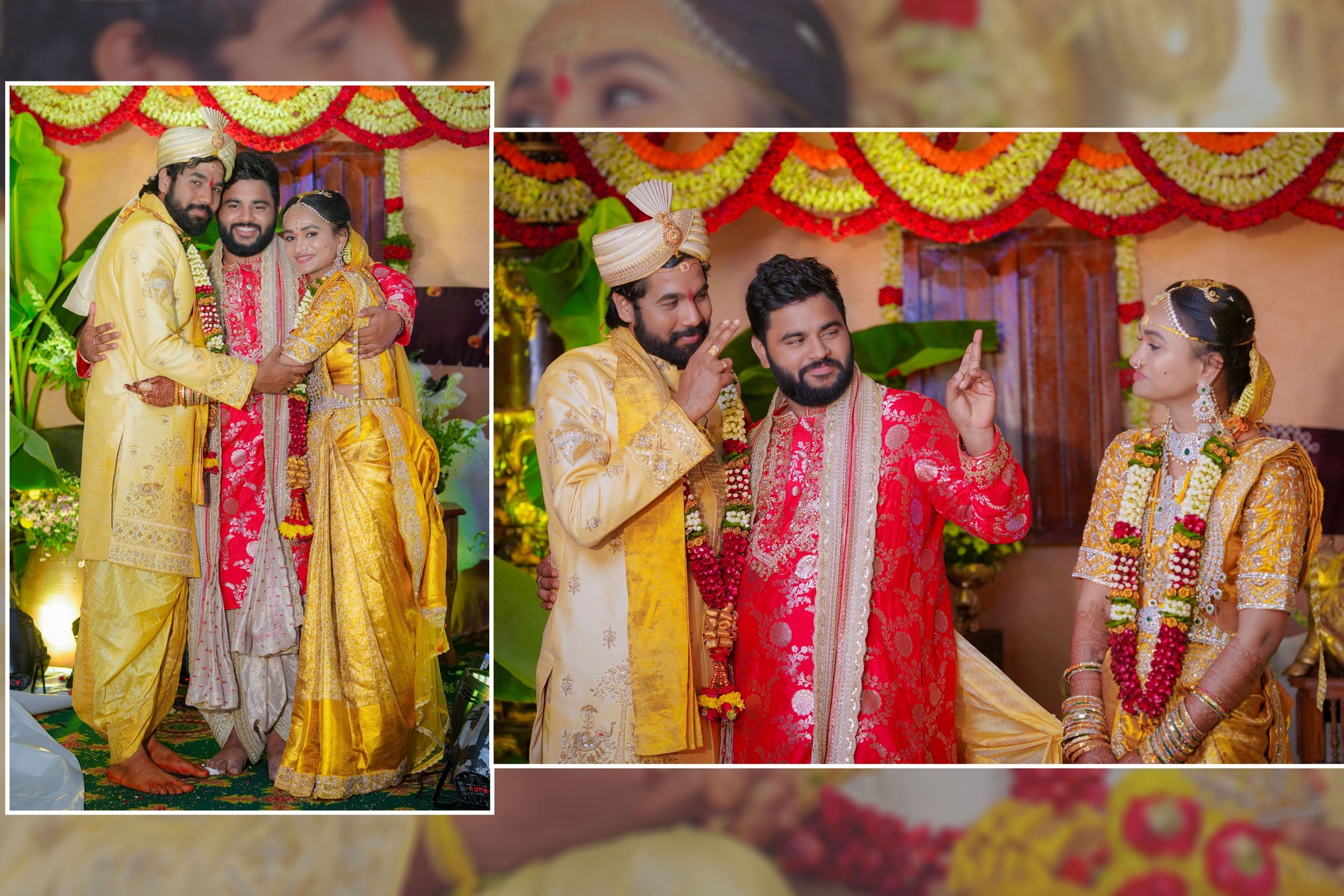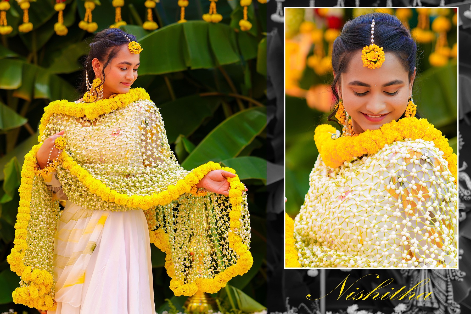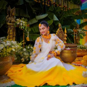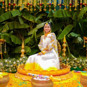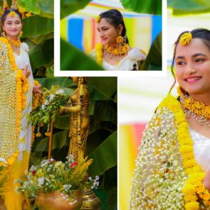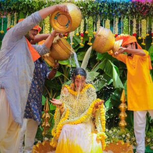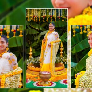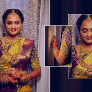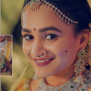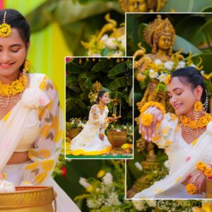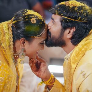 Similarly, Nishitha’s Haldi showcased emotional warmth and elegance. Golden tones enhanced her radiant expressions. Additionally, family members added emotional depth through loving gestures.