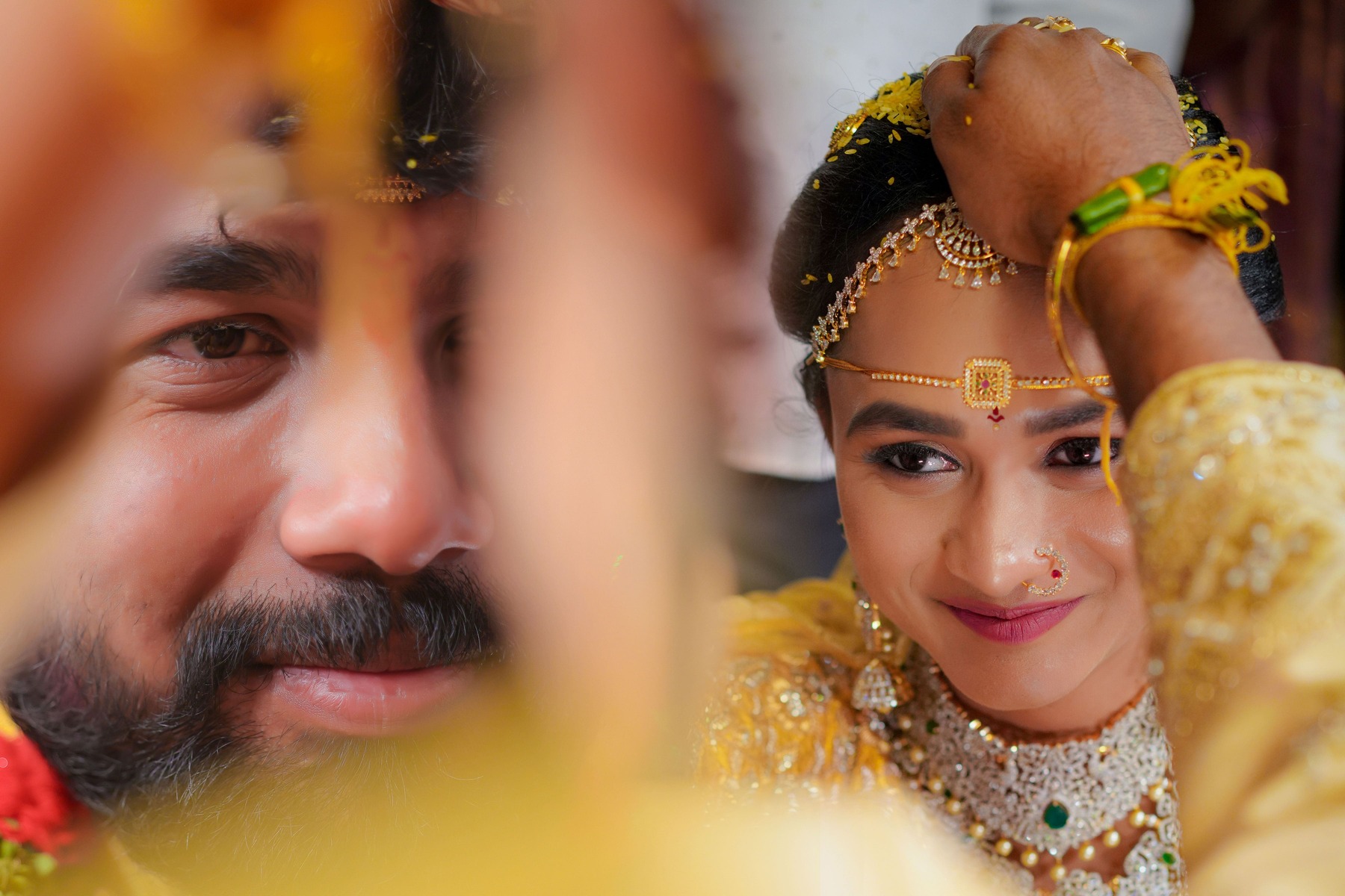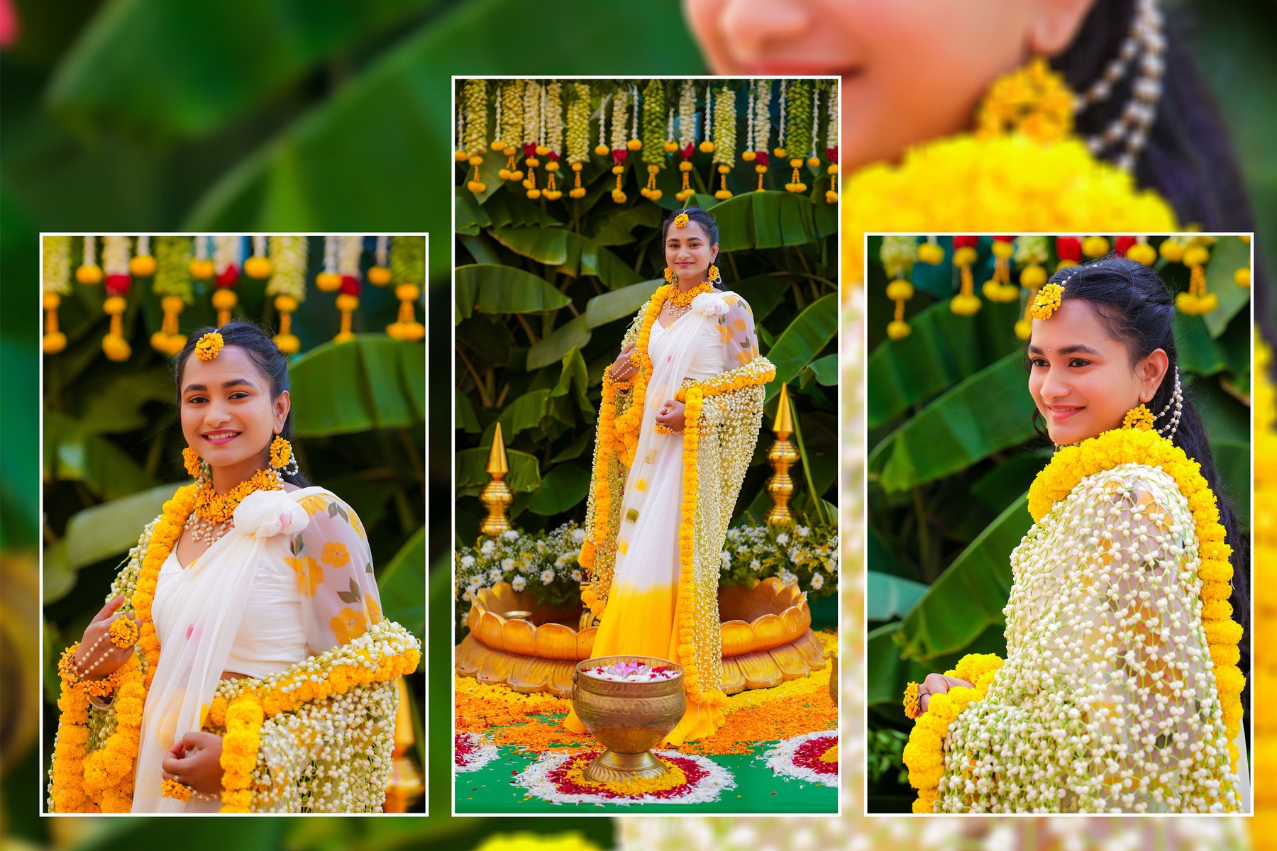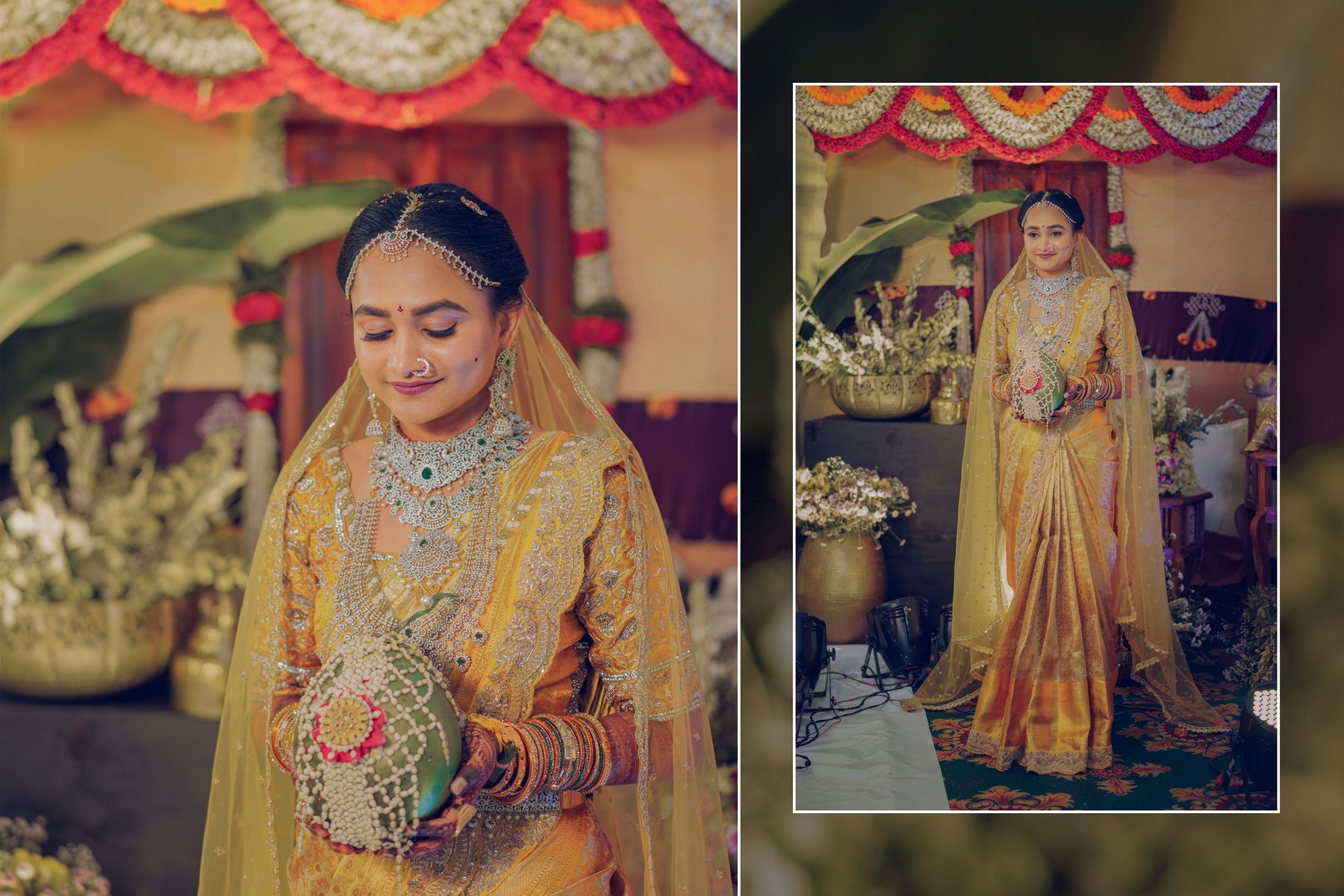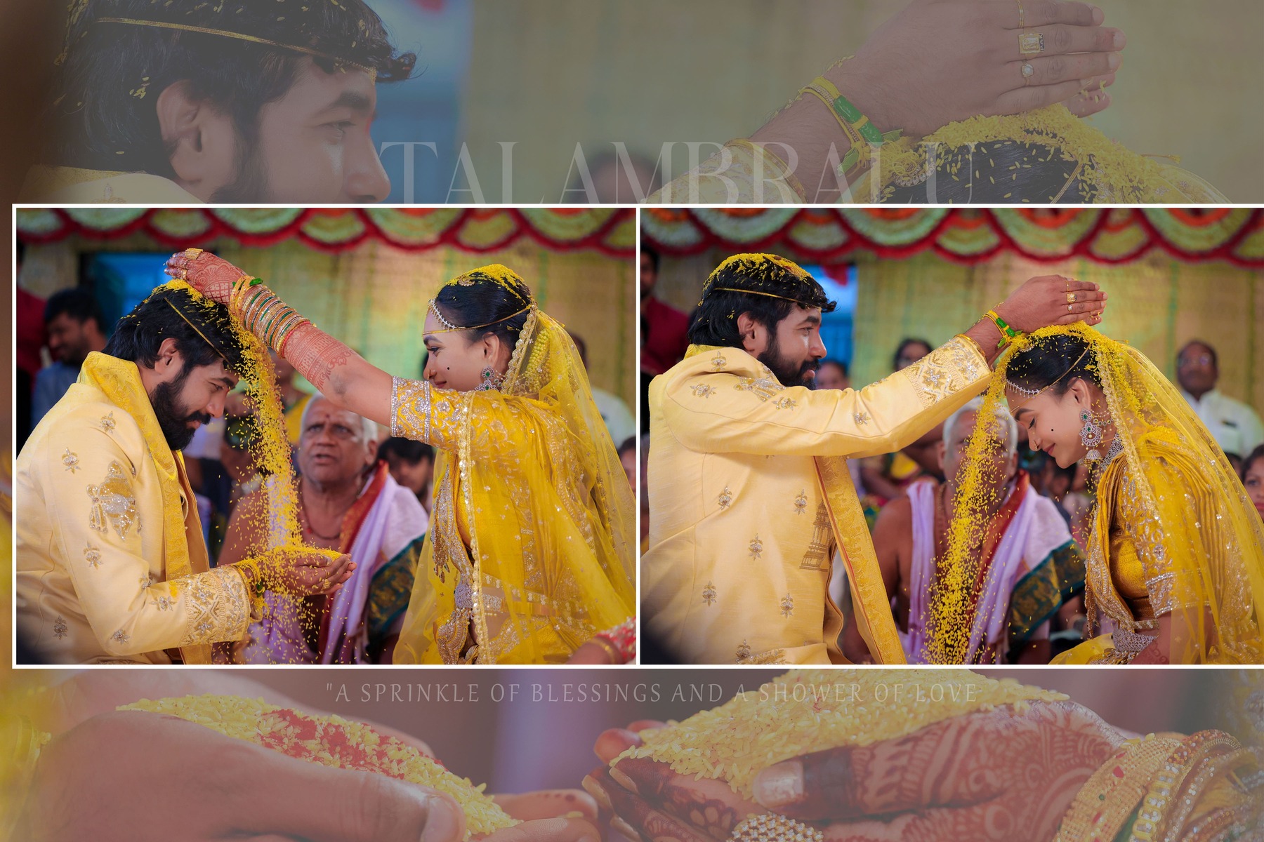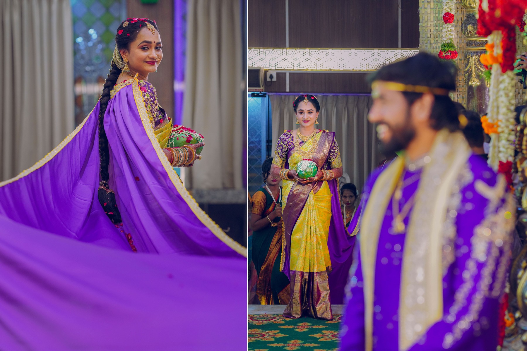 Similarly, Nishitha’s Haldi showcased emotional warmth and elegance. Golden tones enhanced her radiant expressions. Additionally, family members added emotional depth through loving gestures.