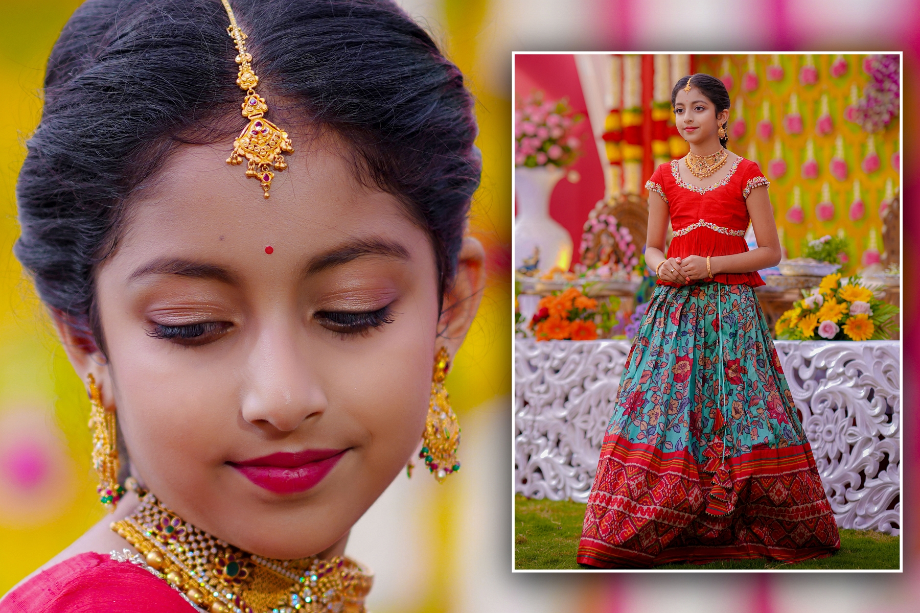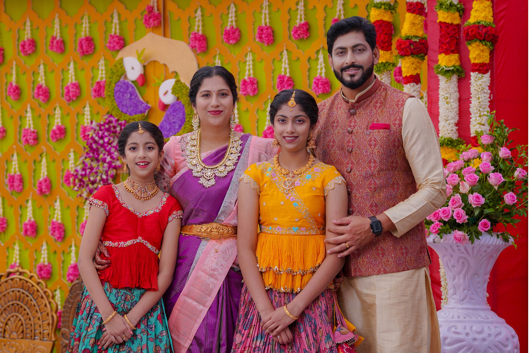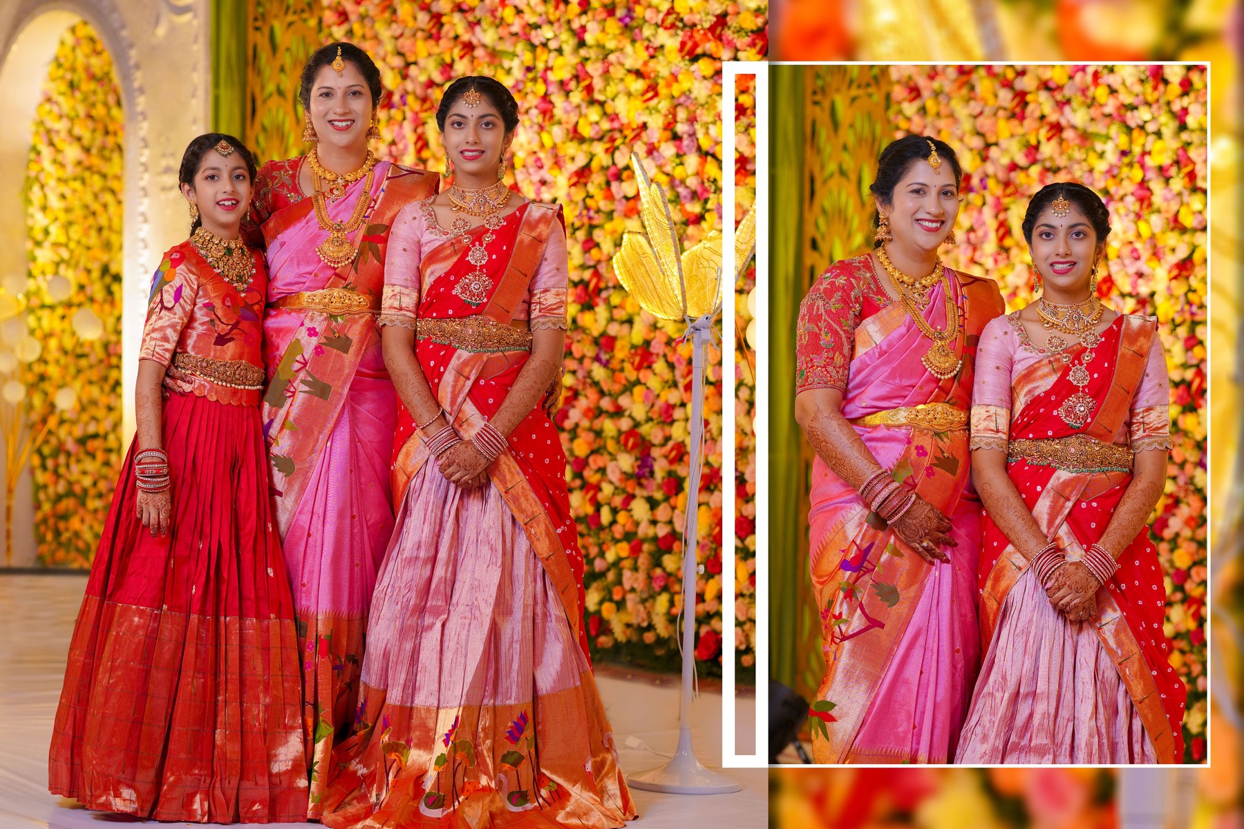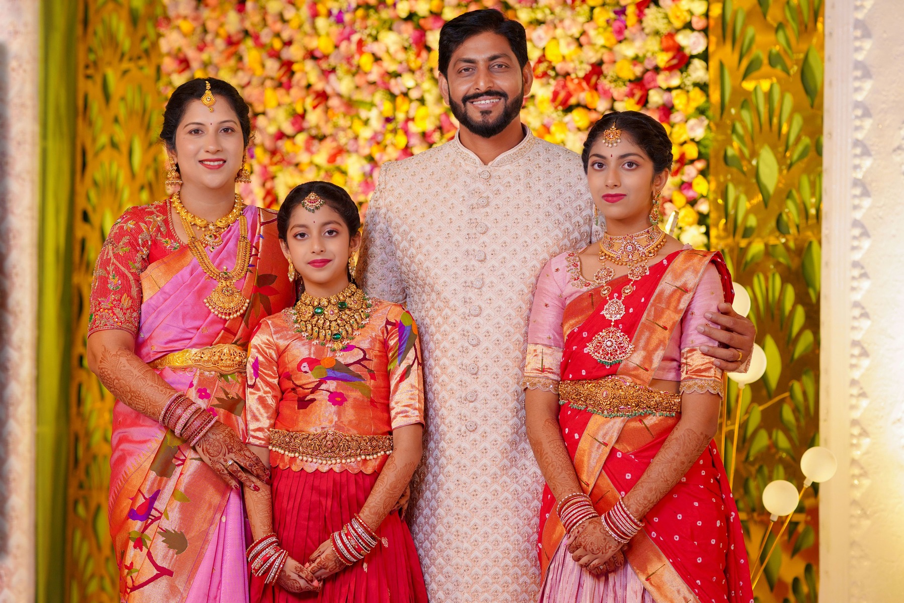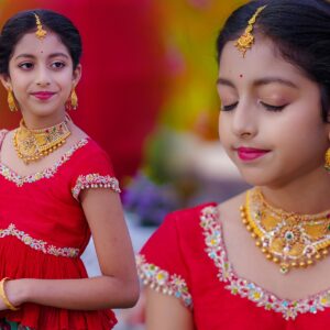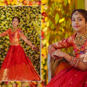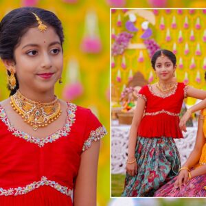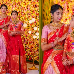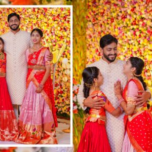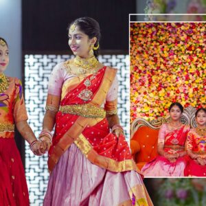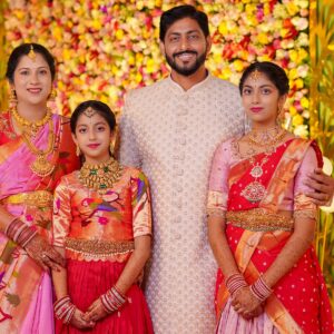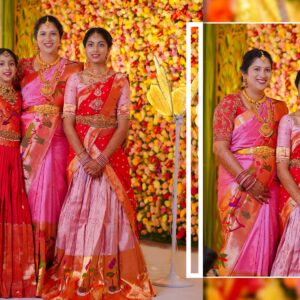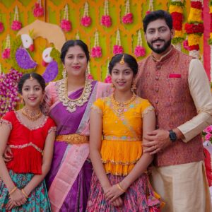The girls’ makeup was flawlessly done by maneesh_katam, highlighting their natural glow and youthful charm. Their stunning outfits from mahalaxmi_paithani_ and arunas_couture reflected vibrant Telugu culture, while their mother radiated elegance in mahalaxmi_paithani_ and jayantireddylabel.