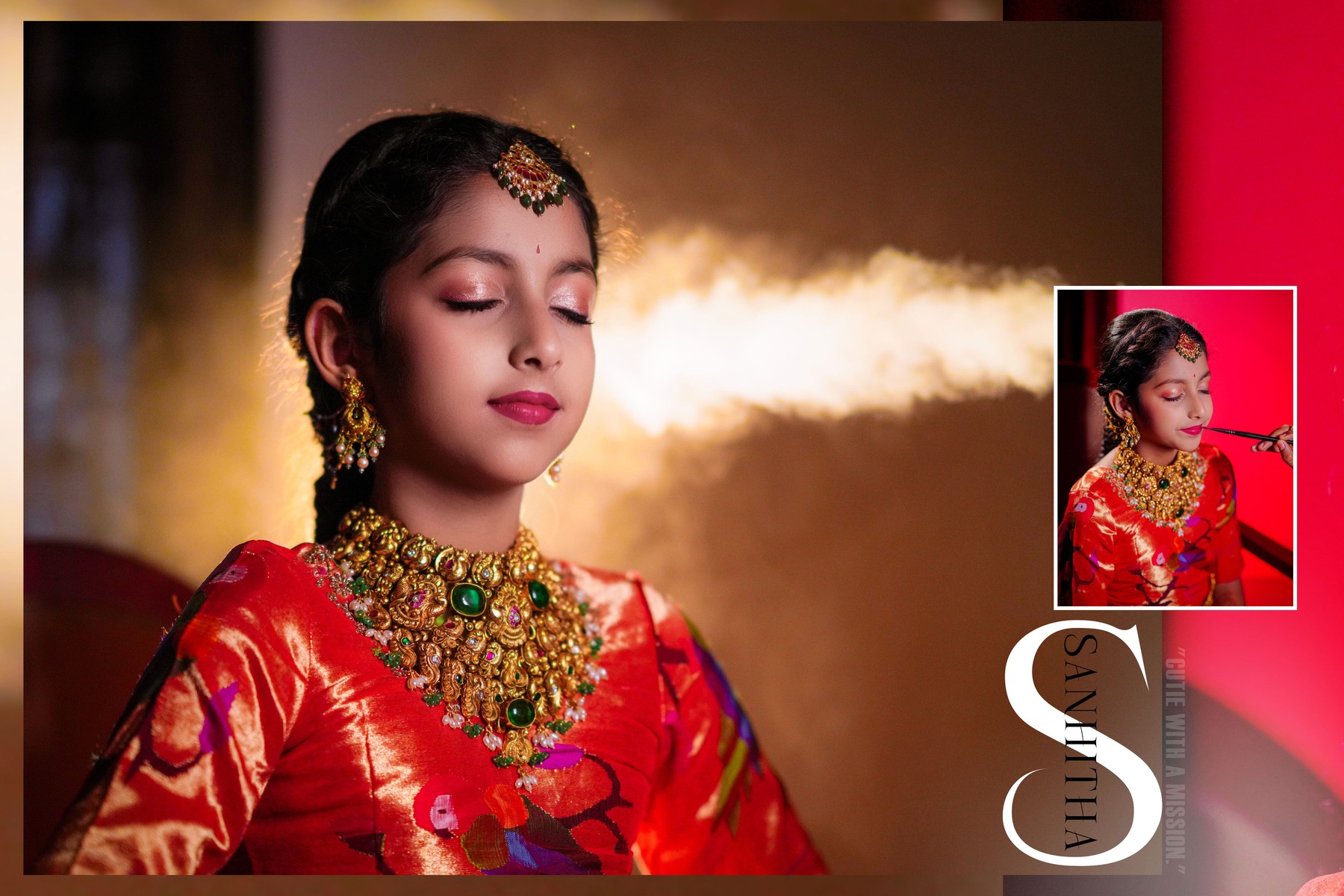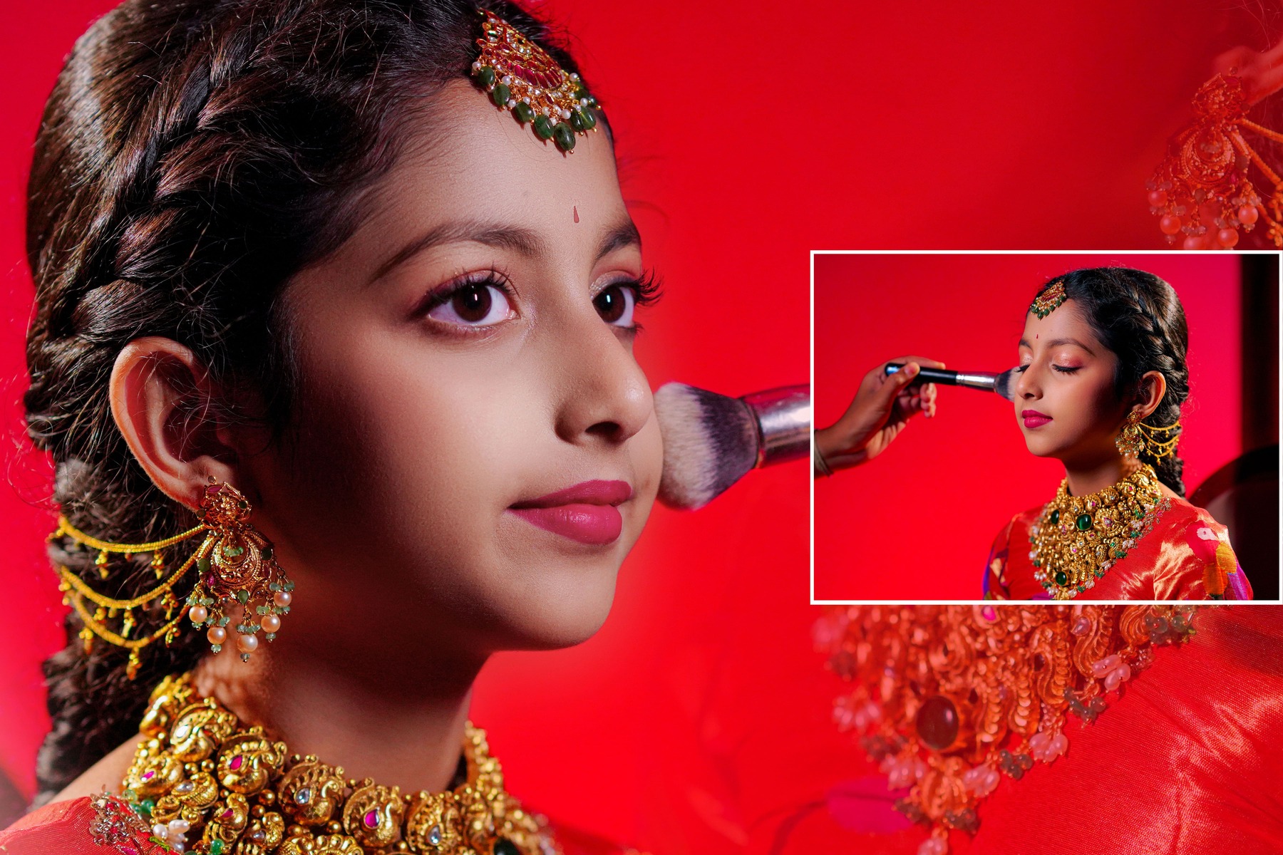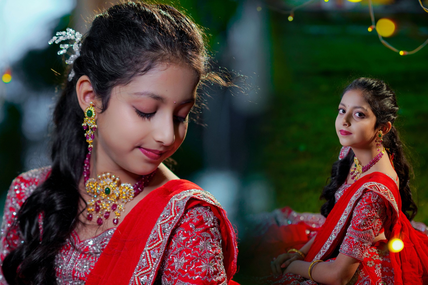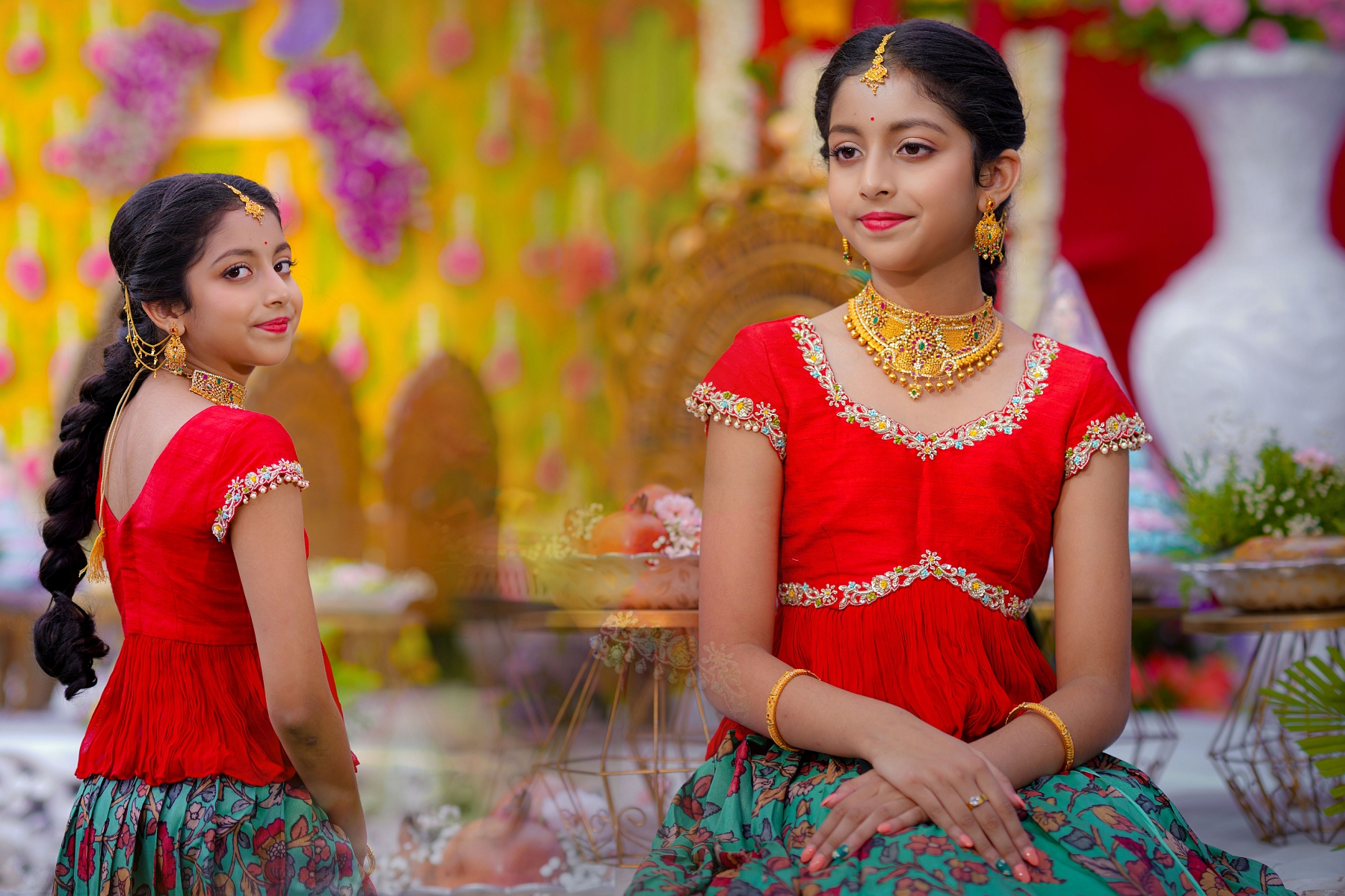 The girls’ makeup was flawlessly done by maneesh_katam, highlighting their natural glow and youthful charm. Their stunning outfits from mahalaxmi_paithani_ and arunas_couture reflected vibrant Telugu culture, while their mother radiated elegance in mahalaxmi_paithani_ and jayantireddylabel.