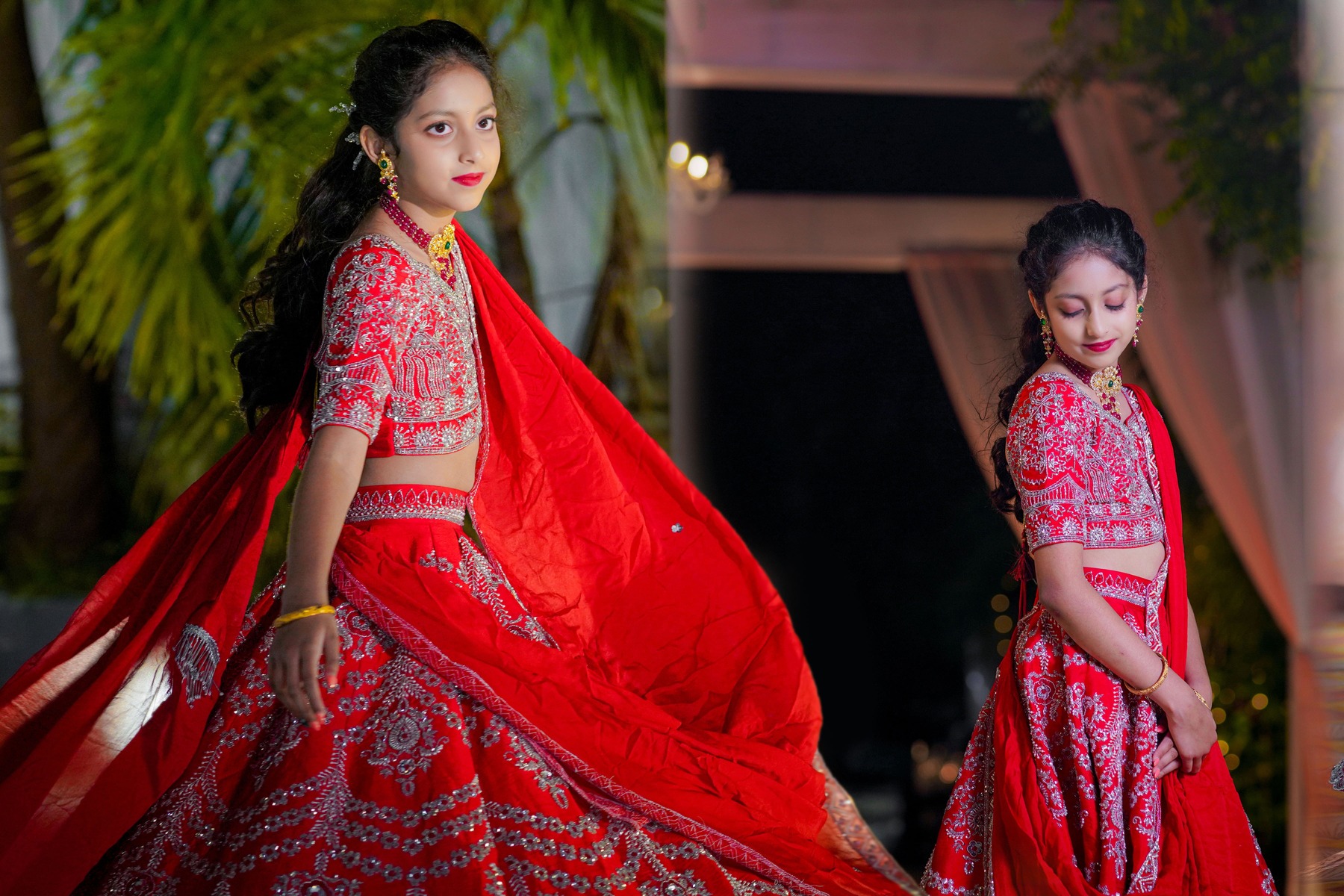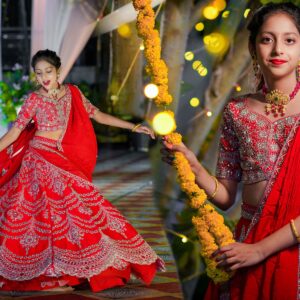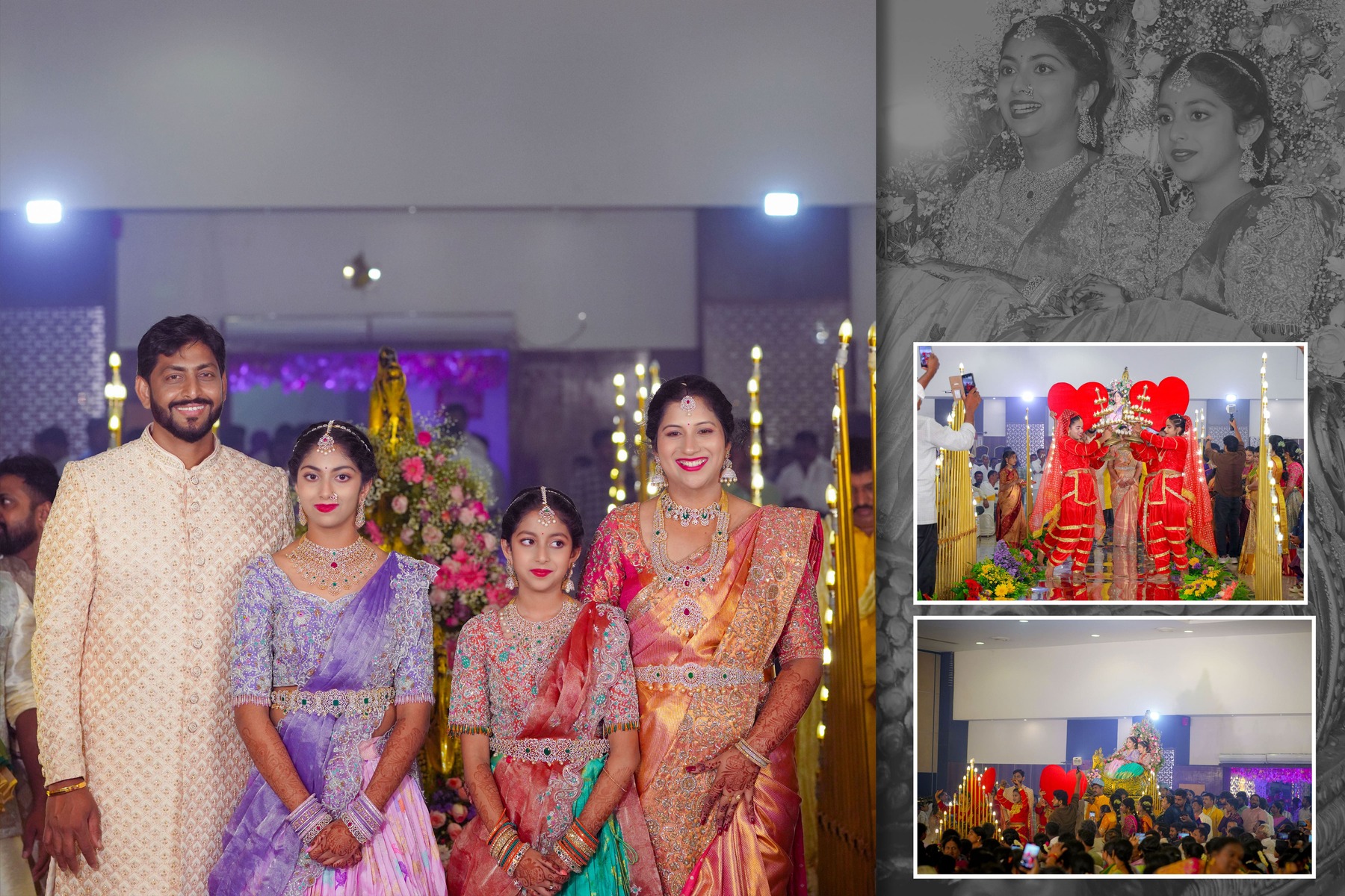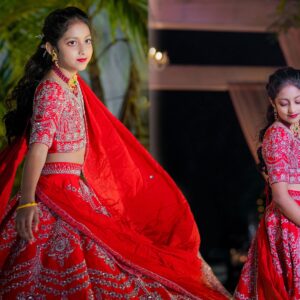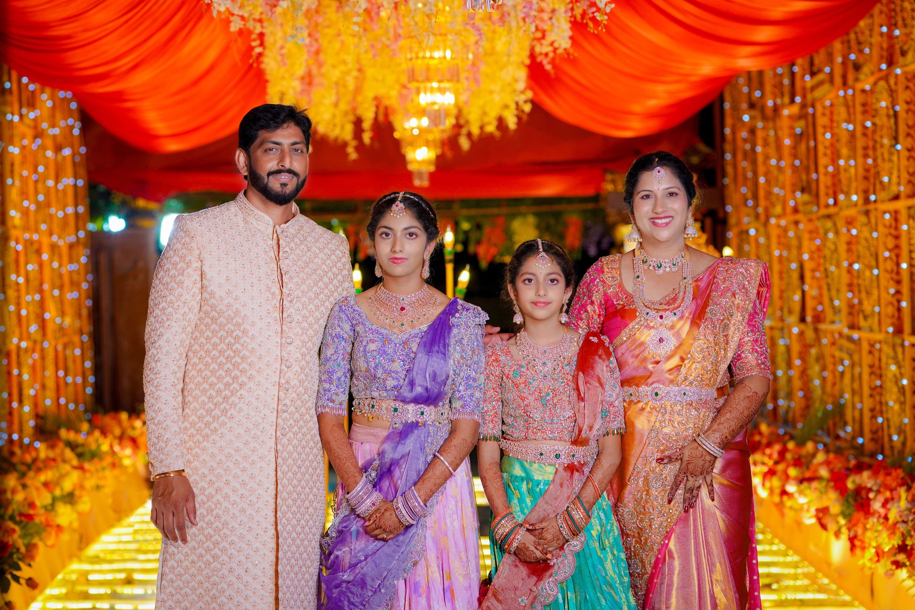 The girls looked breathtaking — one in a purple lehenga by manishmalhotravows and the other in a red lehenga by jayantireddylabel. Their mother graced the evening in an elegant outfit from anupellakuruofficial, while their father looked dashing in varunchakkilam.