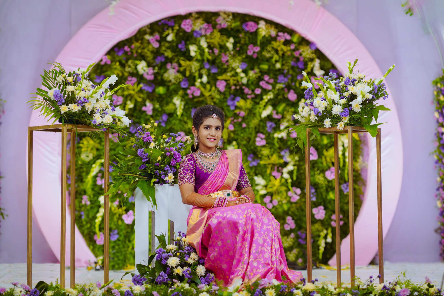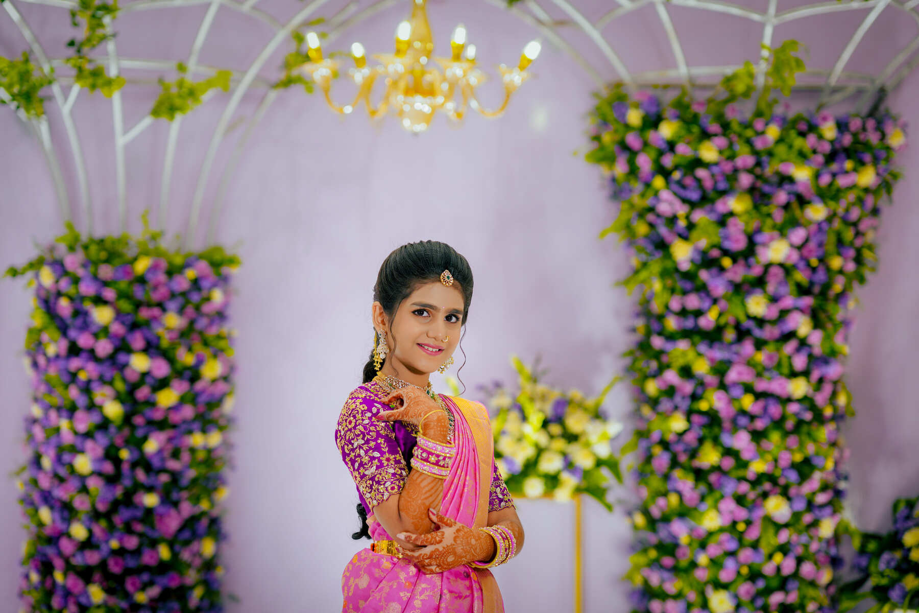 On the day of the event, PixelMatrix Photography’s team arrives early to capture every detail. They begin by capturing shots of the decor and arrangements, which sets the tone for the event. The team then moves on to capturing the little details, such as the intricate designs of the half saree and the accessories worn by the young girl.